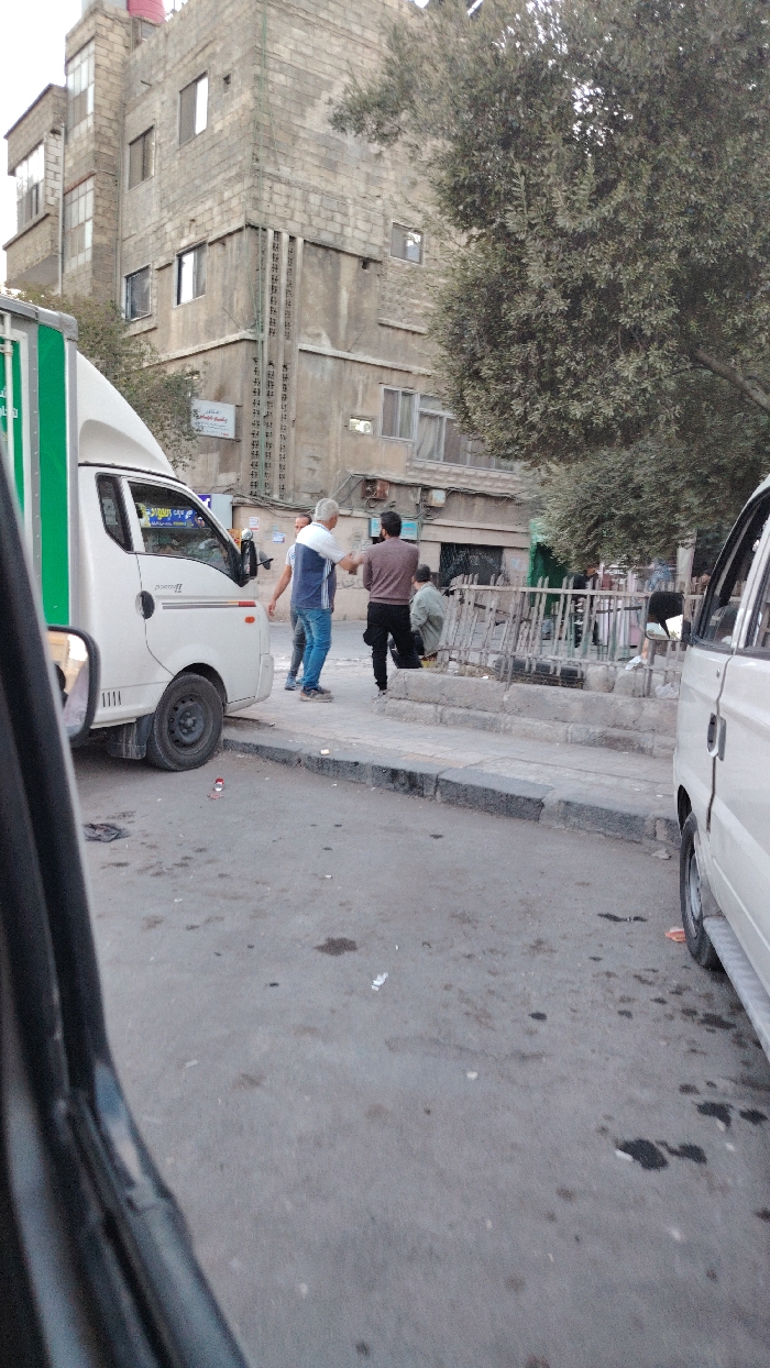 The image displays an urban street scene in Al-Qaboun Municipality, Syria, captured from a low vantage point within a vehicle. The foreground consists of asphalt pavement, showing various stains and scattered refuse, including a red and white plastic container near the curb. On the left, the front section of a white delivery truck, featuring green vertical stripes and "Port 27" branding, is parked or stopped. Adjacent to the truck, on the sidewalk, three adult males are present. One man with grey hair, dressed in a white and blue short-sleeved shirt and blue jeans, stands facing a second man wearing a dark brown long-sleeved shirt and dark trousers; both appear engaged in an interaction. A third man, in a light-colored top, is partially obscured as he crouches behind a low concrete barrier or planter to the right. Beyond the concrete barrier, a structure composed of vertical metal rods is visible. On the far right, the front portion of a white van is partially visible, indicating another parked or stopped vehicle. The background is dominated by a multi-story building constructed of light-colored, possibly concrete, blocks with multiple windows and external utility conduits. A large, dense-foliage tree stands prominently on the right, partially obscuring the building. The sky is bright, suggesting daytime conditions.