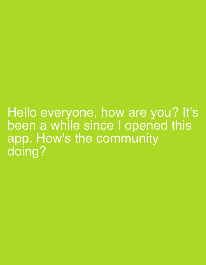 The scene is situated in Lhokseumawe, Indonesia. It depicts a digital interface featuring white sans-serif text centered against a solid lime green background. The text reads: "Hello everyone, how are you? It's been a while since I opened this app. How's the community doing?" No individuals, physical objects, or discernible actions are visibly present within this digital display beyond the presented text and its background. The text indicates a greeting and an inquiry from an implied sender to an implied recipient community within a digital application.