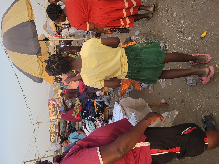 A busy outdoor market scene. People browse through piles of clothes spread on tables and the ground. One individual in a red dress and another in a yellow top and green skirt stand out. An umbrella offers shade, and various advertisements adorn the background. The ground appears to be a mix of dirt and scattered debris. Footwear ranges from sandals to closed shoes, adding to the lively atmosphere of the market.