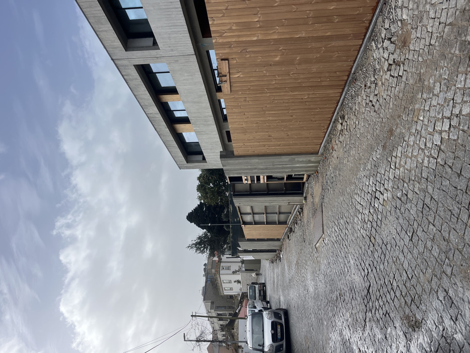This image depicts a cobblestone street, identified as being in Porto, Portugal, under an overcast sky during daytime. The street slopes gently uphill and appears damp, possibly from recent rain. On the left side of the street, three vehicles are parked sequentially, facing away from the camera. The nearest is a white Fiat Doblo van with Portuguese license plate 58-96-XJ. Behind it are another white van and a darker, partially obscured vehicle. Further up the street, a lone pedestrian walks away from the camera on the left sidewalk. A series of residential buildings, including traditional white-painted structures and more modern designs, line the left side, interspersed with utility poles and overhead wiring. The right side of the street is dominated by a construction or renovation site. In the foreground, a tall, light-brown wooden fence or sliding gate, approximately 2 meters high, extends along the property line, featuring a metal track at its base. Behind and to the left of this wooden barrier, a concrete wall section is visible. Further into the property, another wooden gate segment appears partially open, revealing concrete structural elements and forms within. This construction is integrated with a multi-story building on the far right, which features a raw concrete facade, rectangular windows with dark frames, and some wooden accents around the window openings on its upper floors. Green foliage and trees are visible behind the construction site, separating it from distant residential buildings on a hillside.