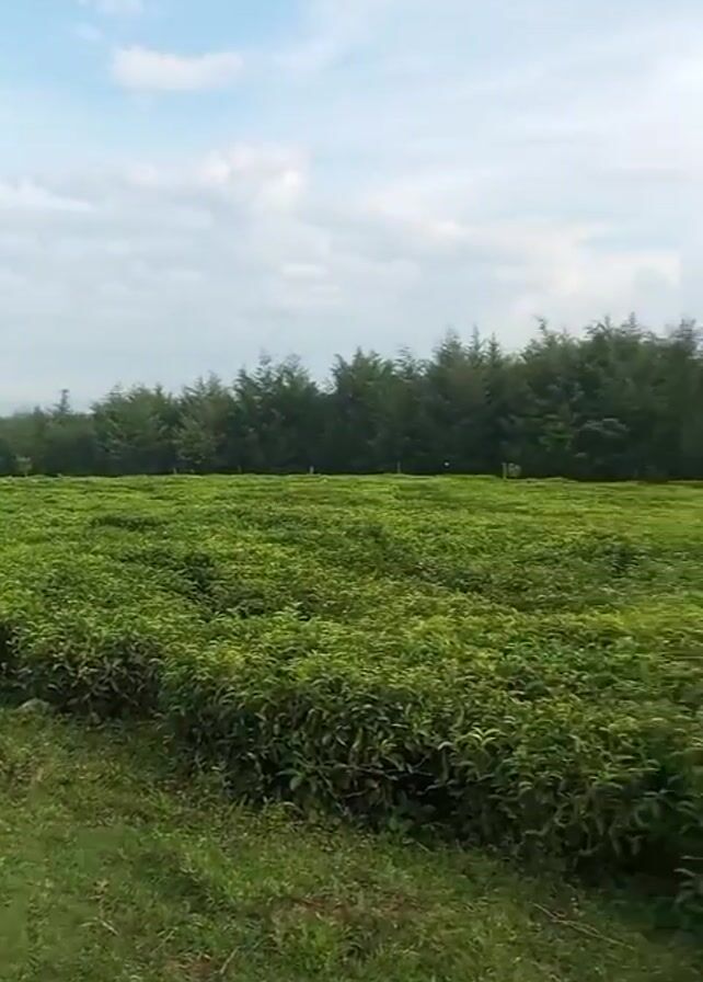 The video presents a panoramic view of a lush green tea plantation under a sky dotted with clouds