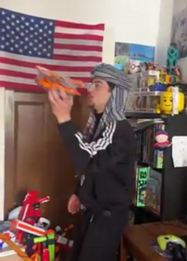 A person wearing a black Adidas sweatsuit and a checkered head covering is holding a large orange and gray toy plane. They raise it above their head in front of an American flag hanging on a door, then bring it back down to hold at eye level. The room is cluttered, with Nerf guns piled near the door, a shelf of various toys, a desk with a computer mouse, and a framed photo of a city on the wall.
