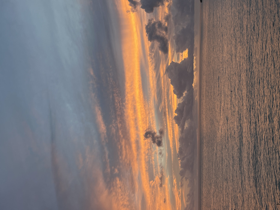 The image captures a serene sunset over the ocean. Golden light streaks across the sky, punctuated by wisps of clouds and denser cloud formations. The ocean mirrors the sky's hues, its surface rippling gently. The overall scene evokes peace and tranquility.