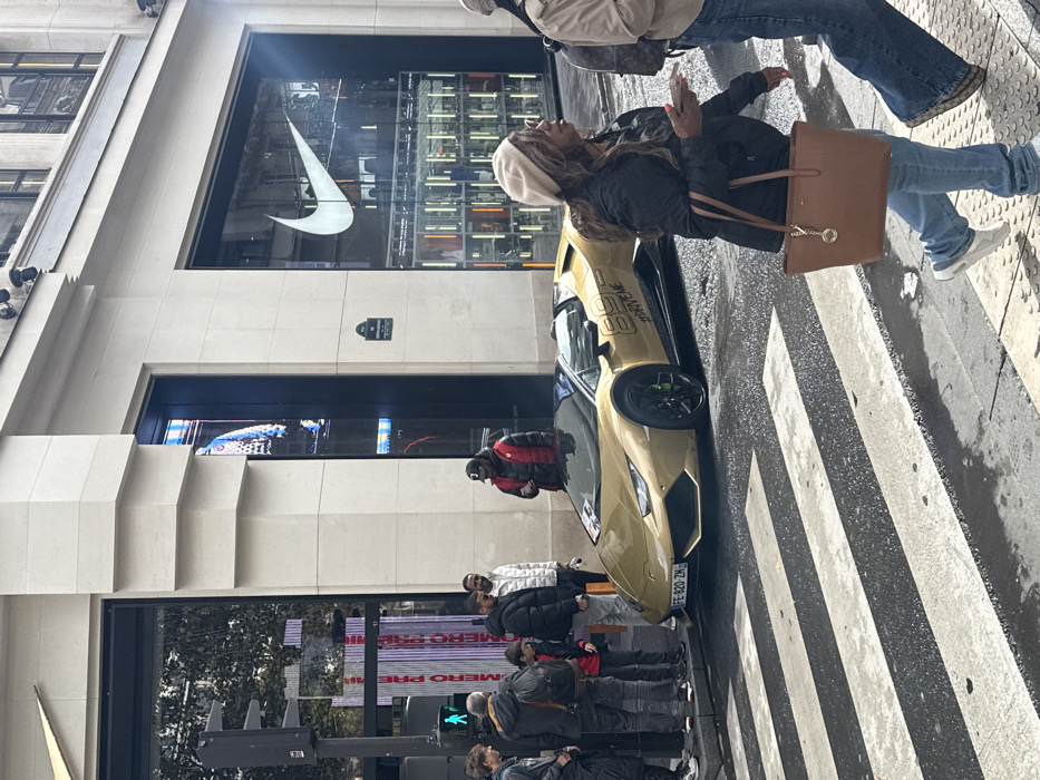 A gold Lamborghini Huracán convertible, featuring "89 #DRIVEME" decals and French license plate FE-820-ZM, is parked on a wet street next to a curb. This scene is located on Rue de la Boétie, Paris, France, against the backdrop of a multi-story, light-colored stone building. The building features large, modern glass storefronts; the one on the right prominently displays a white Nike swoosh logo on a dark background, indicating a Nike store. The storefront on the left reflects trees and structures from across the street. Approximately seven individuals, including adults and one child in a red top, are gathered on the left sidewalk observing the car. A man in a red puffer vest and a black baseball cap stands by the Lamborghini's passenger side, facing towards it. In the right foreground, a woman wearing a black jacket, blue jeans, and a light-colored beret, carrying a brown tote bag and holding a smartphone, walks across a pedestrian zebra crossing from right to left. A second person is partially visible next to her. A black traffic light pole with a green pedestrian signal is visible on the far left. The street asphalt is wet, suggesting recent precipitation or an overcast day.