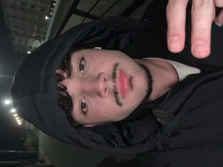 A person with a hooded jacket poses for a photo at night. The individual has short, curly dark hair, brown eyes, and stubble. Two fingers are held up in the top right corner. The background shows blurry lights. The jacket is a dark color, possibly black. The person's face is slightly flushed. An earbud is visible in the left ear.