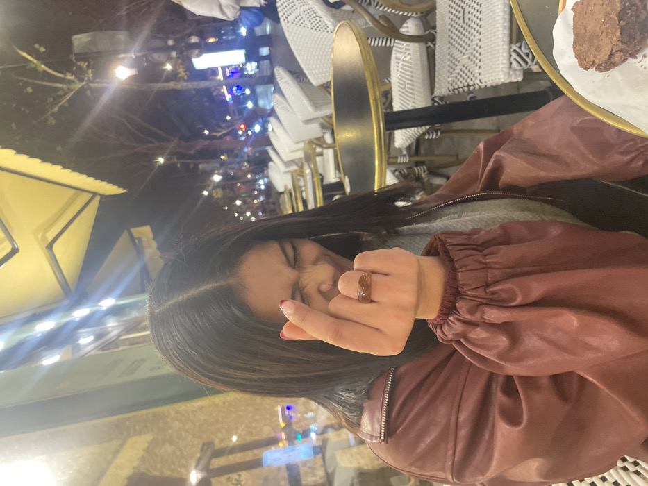 A woman seated at an outdoor cafe table is wearing a brown leather jacket and giving the middle finger with a ring on her finger. Her dark hair is parted in the middle. Behind her, there are white bistro chairs and tables, street lights, and some holiday decorations. A dessert item rests on a plate on the table. The photo is slightly out of focus.