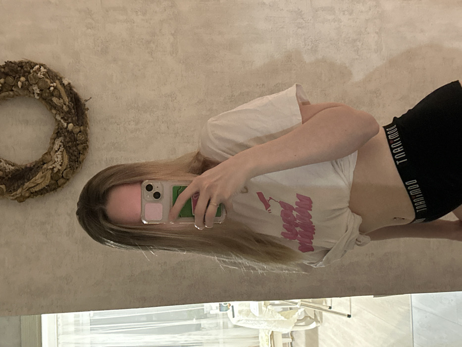 The image captures a female subject taking a mirror selfie indoors. The precise location within Chaikovsky, Russia, is not discernible from the visual evidence. The subject has long, light brown or blonde hair that falls over her shoulders. Her face is obscured by the smartphone she is holding with her right hand, which also displays a small, simple ring on the ring finger. The smartphone features a light pink or clear protective case and a three-lens camera array, with a green card or object visible on the back of the case. She is wearing a white t-shirt with a pink graphic design and partial text, possibly "Lady VIVIEN" or similar, which is knotted at the front, exposing her midriff and a navel piercing. Below the t-shirt, she wears black boxer-style shorts with "TOOHMOO" printed in white repeatedly on the waistband. The background consists of a wall covered with textured, light-colored wallpaper. Above the subject's head, a decorative wreath made from various natural materials such as twigs, dried flowers, and seed pods is affixed to the wall. To the left, a reflection in the mirror reveals a portion of a room containing a window with sheer white curtains, a white table, and a white chair.