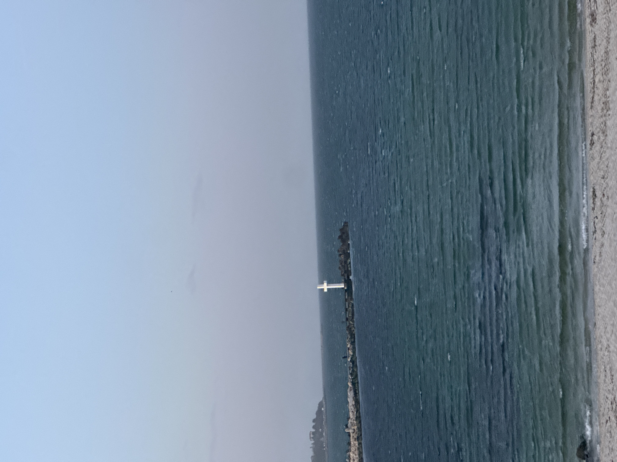 The image depicts a seascape in Varna, Bulgaria, featuring the Black Sea under an overcast sky. A breakwater with a prominent white cross structure sits in the middle ground, extending into the water. The shoreline, with a sandy beach, is visible on the right. The sea appears calm, with subtle waves. The cross structure is a key object, possibly a memorial or navigational aid.