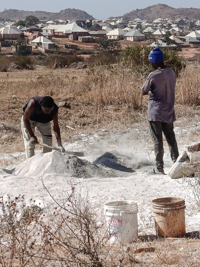 The image depicts an outdoor scene in Dong, Nigeria, featuring two males engaged in or observing construction material preparation on dry, light-colored earth with sparse, brown vegetation