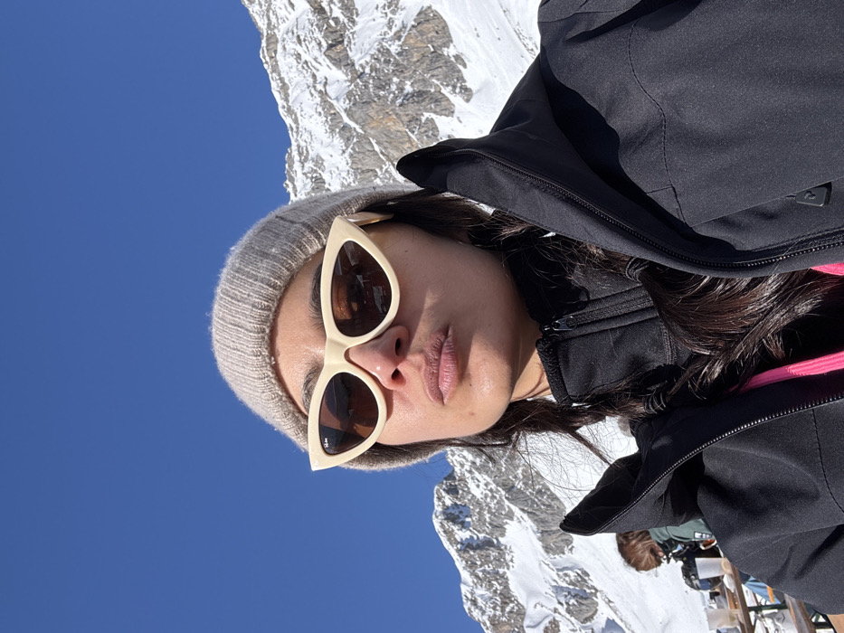 A female subject is depicted in a close-up photograph, set against a backdrop of snow-covered mountains and a clear blue sky in Klösterle, Austria