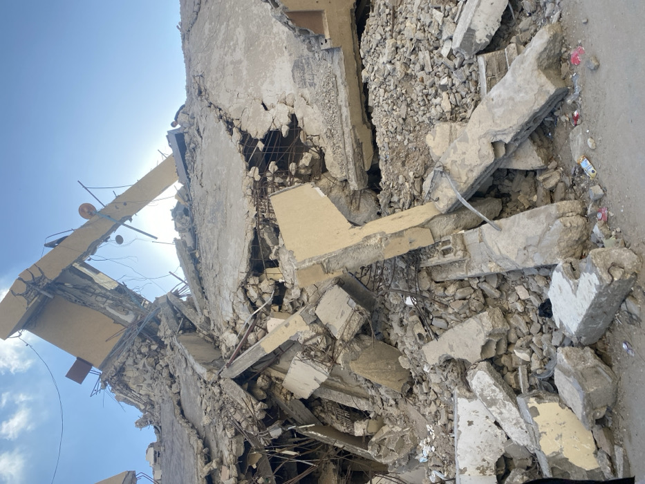 - "The image depicts the extensive collapse of a multi-story concrete building in al-Qarara, Palestinian Territory, under a clear, bright blue sky with the sun partially obscured by debris" by FM-U9GOy1, licensed under CC BY 4.0