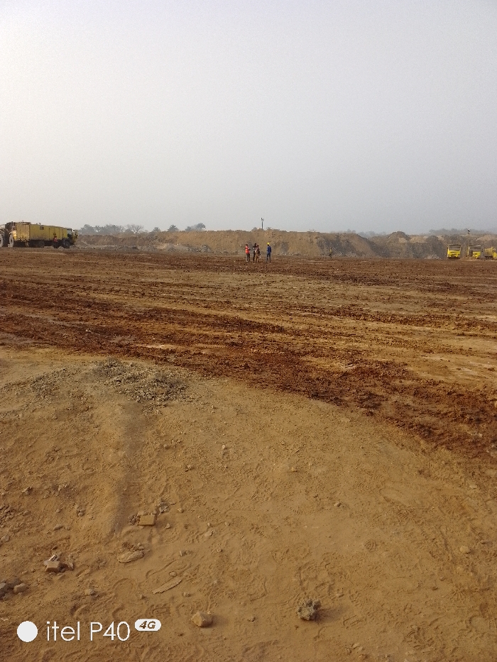An expansive, partially worked landscape under a hazy sky is depicted. A large yellow truck rests on the left edge. Furrowed earth and muddy patches stretch toward a low ridge dotted with sparse vegetation. Several figures stand in the middle distance near piles of excavated material. Heavy machinery is vaguely visible on the right horizon. The foreground features light brown earth, marked with tracks and small rocks. An "itel P40 4G" watermark is visible at the bottom left corner.