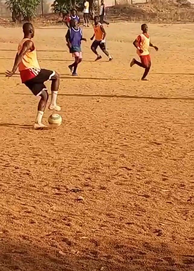 soccer game on a sandy field. Several young men are running and kicking a soccer ball. Some wear orange jerseys, others blue. The field is dirt with scattered grass. In the background are trees, a building, a wall, and a streetlight. The sky is bright. The camera follows the action of the game.