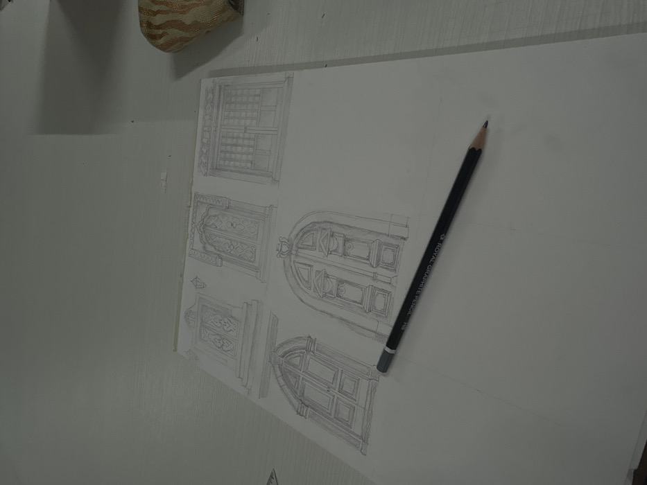 A sketch of four different architectural doors is on white paper alongside a Royal Graphite Pencil