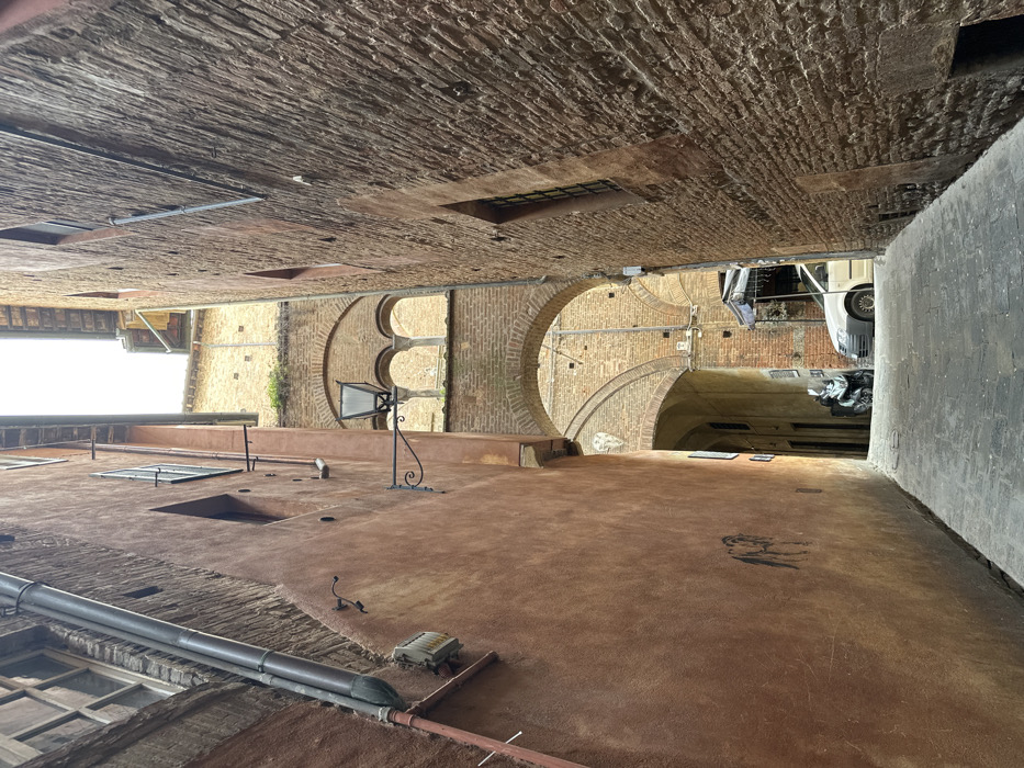 The image captures a narrow, uphill cobblestone alleyway in Siena, Italy, specifically Vicolo del Costone, leading towards the complex of arches associated with the Fonte Gaia and Piazza del Campo. The left side of the alley features a tall building with a reddish-brown, textured plaster facade. Details include a dark metal downspout running vertically, a small white electrical box, and a single rectangular window high up. A dark metal lantern on an ornate scrollwork bracket extends from this wall. Abstract black graffiti is visible on the lower section of the plaster. The right side of the alley is bordered by a tall, reddish-brown brick building wall. This wall displays multiple rectangular windows with dark frames at varying heights, and a section of a horizontal pipe is visible. The alley floor is paved with irregular grey cobblestones, sloping gently upwards into the distance. The background is dominated by a series of brick architectural elements. A large, rounded brick archway spans the alley, forming a gateway. Above this, a smaller brick structure features a triple arcade or loggia with three rounded arch openings, and some green foliage is present on its top edge. Further back, additional brick arches and passages are discernible, indicating interconnected structures. Beyond the main archway, a dark-colored motor scooter is parked on the left. On the right, the front and side of a light-colored compact car are partially visible beneath a small, striped blue and white canopy. No individuals are present in the scene. The ambient lighting suggests diffused daylight.