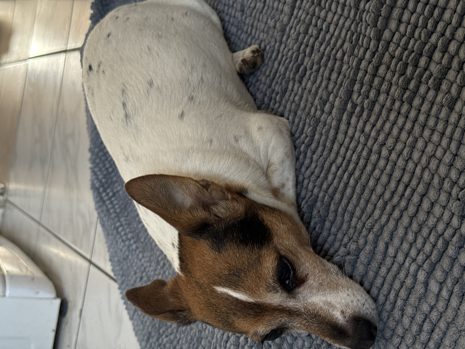 - "A small dog, exhibiting characteristics of a terrier breed such as a Jack Russell, is depicted lying on a gray, textured rug indoors" by FM-k63fK2, licensed under CC BY 4.0