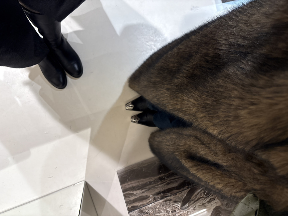 This image captures a high-angle, downward view of two individuals' lower bodies and footwear within an indoor retail environment in Paris, France. The foreground is dominated by a dark brown, possibly fur or faux fur, garment belonging to the person whose perspective the photo is taken from. This individual wears dark blue trousers and black pointed-toe boots featuring metallic silver caps. Adjacent and slightly behind, to the right, a second person stands in black trousers and plain black ankle boots. Both stand on a bright white, reflective floor that exhibits cast shadows. To the left, a sharp corner of a reflective surface, possibly a mirror or polished metal fixture, is visible, below which a dark brown and white patterned object resembling marble is present, suggesting a display stand or interior furnishing. The setting appears to be a high-end boutique or department store.