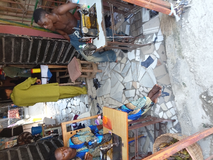 This image depicts a street-side tailoring workshop in Ado, Nigeria