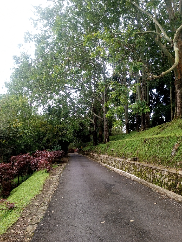 This image displays a paved asphalt road in Padegaon, India, extending linearly into the background before curving slightly to the left. The road surface is dark grey. On the left side of the road, a narrow dirt and gravel shoulder transitions to a patch of green grass, followed by a dense cluster of reddish-purple shrubs. Beyond these shrubs, a wall of dark green foliage and trees rises. On the right side of the road, a concrete curb runs parallel to the asphalt. Adjacent to the curb is a low retaining wall constructed from irregular, moss-covered grey stones. Above this wall, a steep, grass-covered embankment ascends. Numerous tall, deciduous trees with light grey bark and green foliage line the top of the embankment and extend upwards, forming a dense canopy against a bright, overcast sky visible through gaps in the leaves. No individuals, animals, or vehicles are present in the scene.