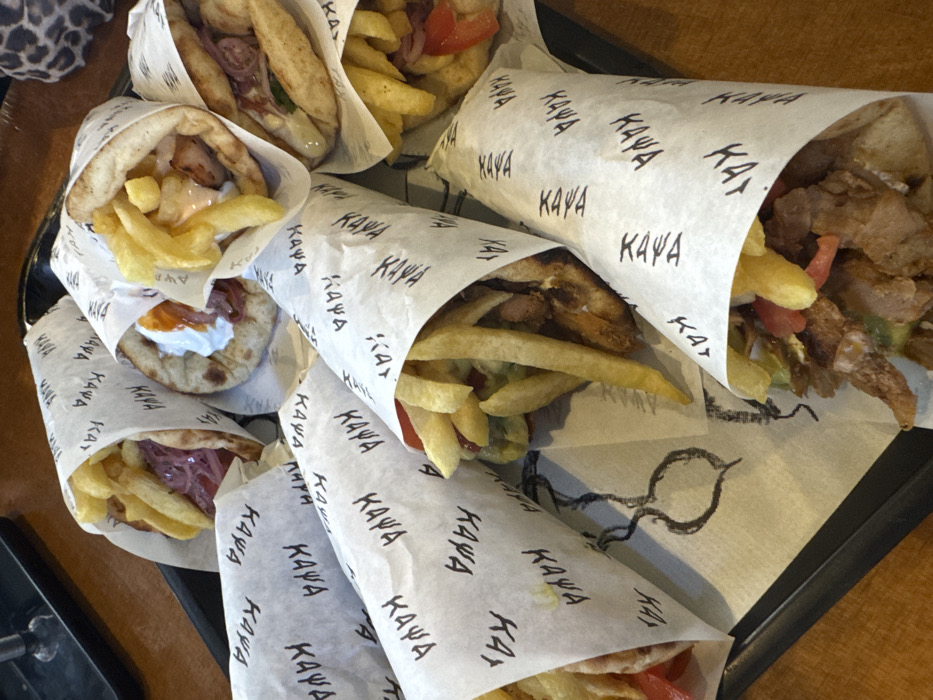 Eight Greek-style wraps, consistent with gyros or souvlaki, are presented on a black rectangular tray. Each wrap consists of pita bread filled with various ingredients including grilled meat (pork or chicken), french fries, chopped red onions, tomatoes, and sauces such as white tzatziki and a reddish-orange condiment. The wraps are partially enveloped in white paper, which is uniformly printed with the word "KAYA" in black, stylized uppercase letters. The tray rests on a light brown wooden table surface. A dark, out-of-focus object is visible in the upper left corner of the background. The scene depicts a meal served in a casual dining environment within the city of Athens, Greece.