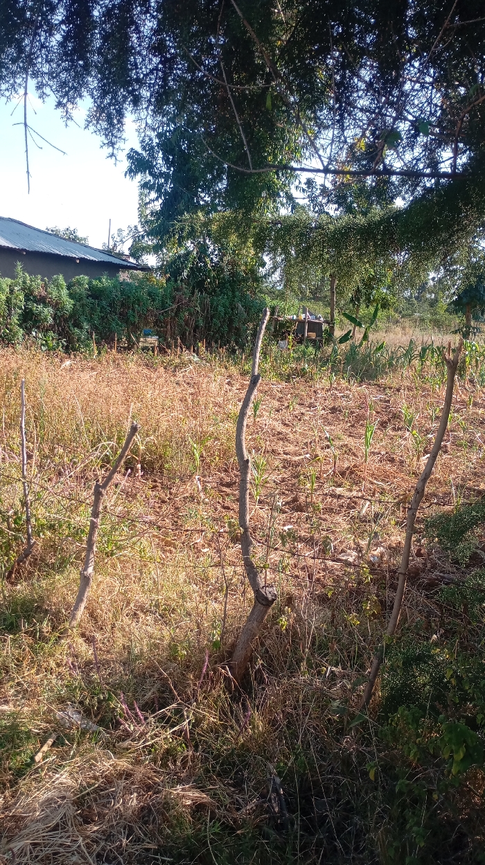 A rural landscape features a fenced field with dry vegetation and young corn plants. Several pruned tree trunks stand as fence posts. In the background, a building with a tin roof is partially visible behind lush green bushes and mature trees. Sunlight bathes the scene, casting shadows and highlighting the textures of the dry grass and foliage.