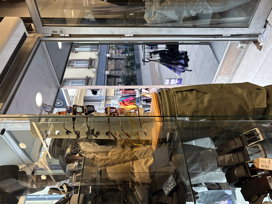 The image depicts a scene viewed from inside a retail store, looking out through an open entrance onto a street in Strasbourg, France. The foreground is dominated by a glass display case on the left, containing various merchandise. On the top shelf, multiple pairs of sunglasses are displayed on a tiered stand, featuring different frame styles and colors, including tortoise shell, dark, and clear frames. Below these, a small wooden block is visible with the word "FUSIONAL" printed on it. Further down, a pair of olive green cargo pants are displayed on a mannequin or stand. The bottom shelf of the display case holds several dark-colored belts with silver-toned buckles, accompanied by price tags or product labels. To the right of the glass display case is an open doorway or passage. An air curtain unit is mounted above this opening. Just outside the entrance, on the right, a metal clothing rack is visible, from which several dark-colored umbrellas are suspended. One umbrella features a pattern including purple tones. The pavement outside the store is visible, made of square and rectangular tiles. A partially visible blue sign with white text is affixed near the store entrance on the left. The background reveals a street scene characteristic of Strasbourg. Across the street, a multi-story building with a light yellow/cream-colored facade is prominent. It features multiple rectangular windows with dark frames, and subtle architectural details below the windows. To the left of this building, another structure with a darker facade and more windows is visible. The street itself appears paved, with planters or low walls containing green foliage lining the street. A dark circular sign with a white letter "F" is visible in the distance on the left side of the street. No individuals or vehicles are distinctly visible on the street.
