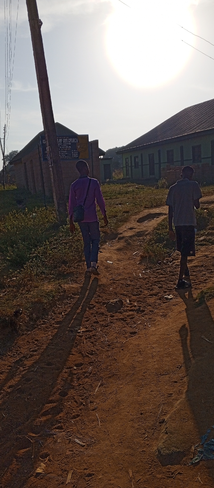 Two people walk along a dirt path away from the camera. The person on the left wears a purple shirt and carries a bag, and the person on the right wears a gray shirt and dark shorts. To the left, a sign for "ASSEMBLIES OF GOD CHURCH" is on a building. Another building with green accents is on the right. Long shadows stretch across the ground towards the viewer. The sun is high and bright in the sky.