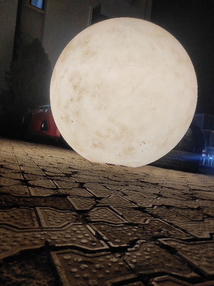 The scene is an outdoor, nighttime view in Abuja, Nigeria, captured from a low-angle perspective. The foreground features a paved surface composed of dark, interlocking concrete pavers, which show signs of wear, cracking, and dirt accumulation within the crevices. Dominating the midground is a large, spherical, internally illuminated object, approximately 2-3 meters in diameter, designed to resemble the moon with discernible surface patterns; its color is off-white to light beige. This object is positioned directly on the paved ground. In the left background, a portion of a red vehicle, likely a car, is visible behind the spherical object, adjacent to a dark building structure and obscured foliage. The right background contains indistinct dark forms, possibly including a large tire, with a faint blue light source emanating from further right. No individuals are present.