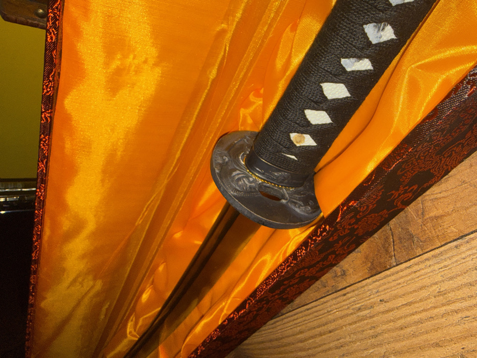 - "The scene, located in Nova Zagora, Bulgaria, displays a katana-style sword resting within an open, ornate presentation box" by FM-JSRLN2, licensed under CC BY 4.0