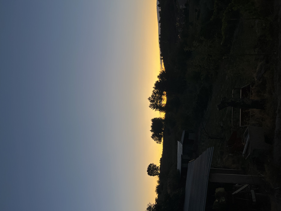 A wide-angle, low-light image depicts a rural or semi-rural landscape at sunset or dusk, situated in the city of Unknown, Unknown. The sky occupies the upper two-thirds, transitioning from a deep blue at the zenith to a lighter blue-grey mid-sky, culminating in a distinct horizontal band of bright orange-yellow along the horizon. The horizon line is defined by the silhouette of rolling hills topped with numerous dark trees, primarily conifers grouped in clusters. The setting or rising sun's orange glow is visible through the foliage of a tree cluster positioned right of center on the horizon. The foreground and midground are predominantly in shadow, rendering details indistinct. In the lower left quadrant, the corrugated metal roof of a structure is partially visible, with dark, unidentifiable walls. Behind and slightly to its right, a second, smaller, darker structure is present. The immediate foreground consists of dark, uneven ground covered with sparse, shadowed vegetation. Towards the lower right, a thick, dark tree trunk or post stands upright. Behind it, a metal gate or fence structure is discernible. To the left of the post, a dark, rectangular object, possibly a utility cart or wheelbarrow, rests on the ground. In the midground, beyond the foreground structures and vegetation, the faint, diffused lights of a distant settlement are visible against the darkening landscape. No human figures are present within the frame. The overall scene is characterized by deep shadows and the contrast of the bright horizon line.