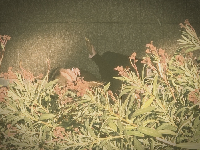 The image depicts a female individual partially obscured by a dense flowering bush at night, in the city of Monaco, Monaco. The subject, positioned on the right, has long, light-colored hair and wears dark clothing. She holds a lit cigarette to her mouth with her right hand, emitting a plume of smoke. Her left hand holds a small, rectangular, light-reflecting object, consistent with a smartphone. The bush, featuring green leaves and reddish-brown flowers, occupies the left and central foreground. Behind the subject and the foliage, a textured, vertical wall, possibly concrete or stucco, is visible, illuminated by an off-frame light source creating a brighter area towards the upper-right.