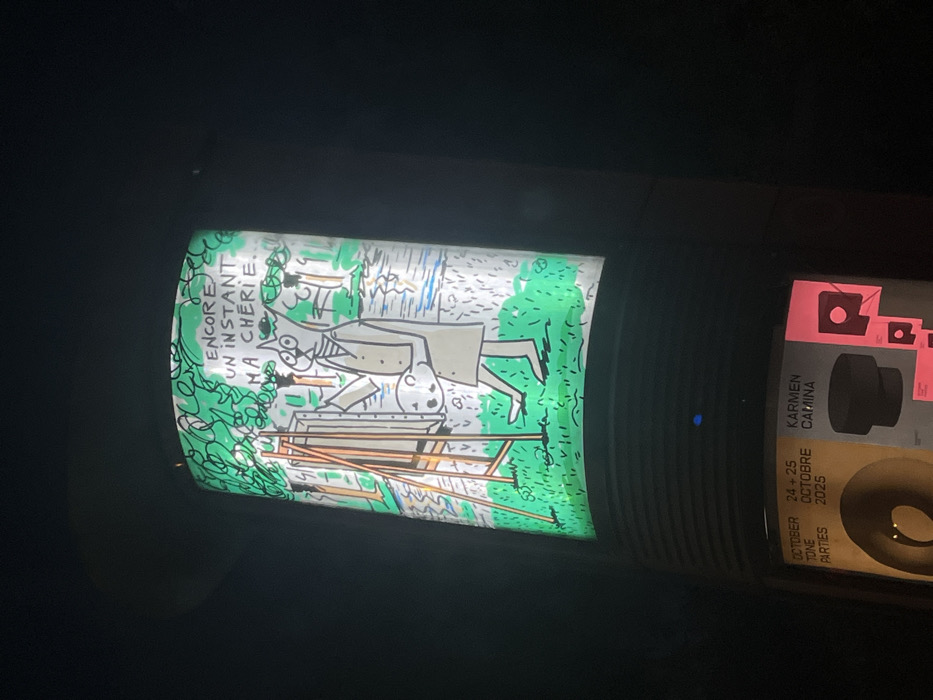 An illuminated outdoor display pillar is depicted at night in Bischheim, France. The pillar features two main sections: an upper cylindrical display and a lower multi-panel section. The upper cylindrical section presents a cartoon illustration of an anthropomorphic bipedal cat, light-colored, wearing a long coat. The cat holds a painter's palette in its left hand and a paintbrush in its right hand, standing beside an easel with a canvas. The background of the illustration depicts a natural outdoor scene with green grass in the foreground, green trees, and a body of water. Above the cat's head, the French text "ENCORE UN INSTANT MA CHÉRIE." is visible. The lower section consists of multiple illuminated rectangular panels displaying event information. One visible panel shows "OCTOBER TONE PARTIES" and the date "24 + 25 OCTOBRE 2025" with an abstract circular graphic. Another panel displays "KARMEN CAMINA" above a similar dark circular object. A third, partially visible panel is red-toned with abstract geometric shapes. The overall scene is brightly lit by the internal illumination of the pillar against a dark background.