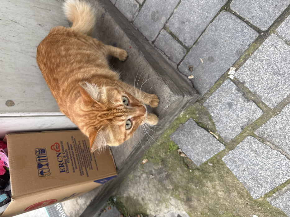 - "An orange tabby cat with green eyes and prominent white whiskers stands on a concrete step in an urban environment" by FM-E68DV2, licensed under CC BY 4.0