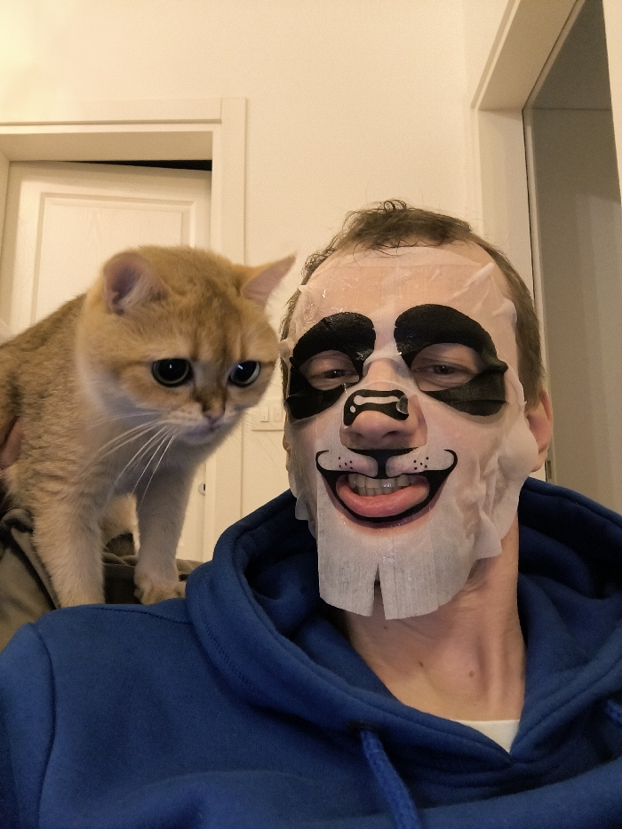 A man wearing a blue hoodie and a panda-themed facial mask is captured in a selfie. His tongue is sticking out. A golden-furred cat with large, expressive eyes is perched on his shoulder. A partially visible door frame in the background suggests an indoor setting. The lighting is soft and diffused, casting a warm tone on the scene. The focus is sharp on both the man's face and the cat, creating a playful and intimate portrait.