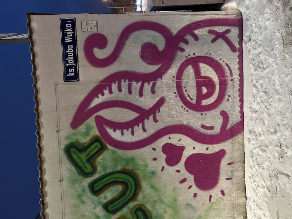 A white wall with colorful graffiti. A pink design resembling a face with abstract eyes and a circle containing a "D" and "P" inside. Below are two pink hearts with radiating lines. Underneath, green shapes, possibly letters. In the upper left, a blue street sign reads "Ks. Jakuba Wujka". To the right, a snowy surface suggests a winter setting. The sky in the background is a dark blue.