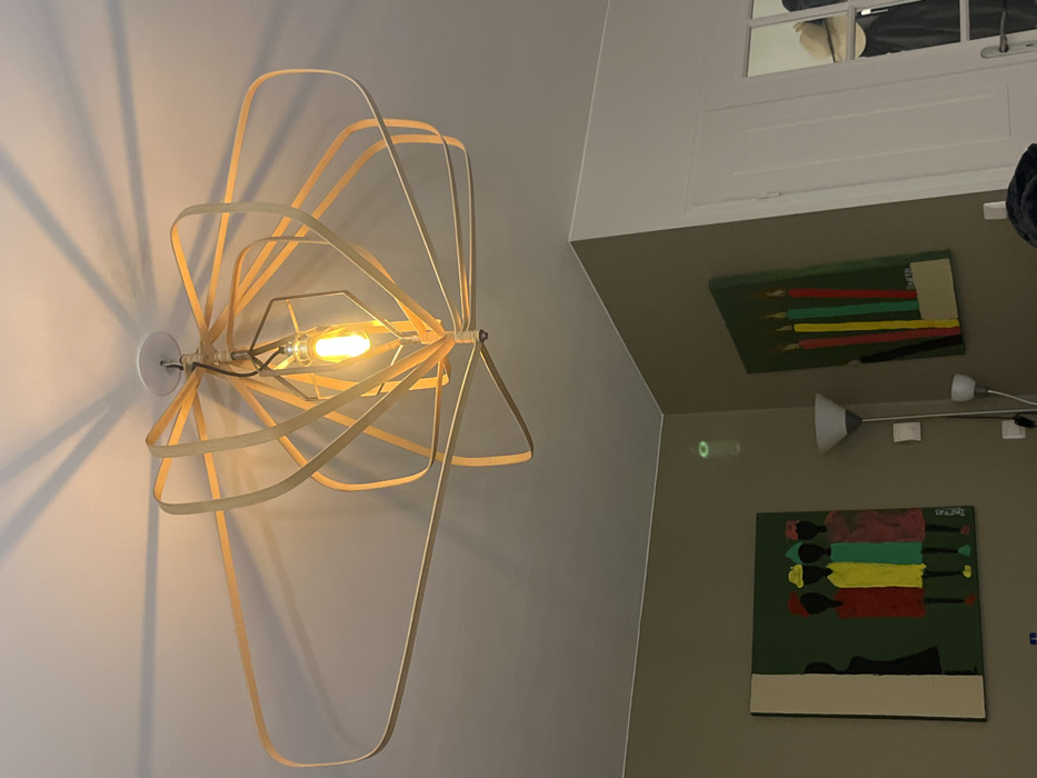 A modern wall lamp with a bare incandescent bulb and light wood framework casts a radial shadow on a gray wall. The lamp is mounted on a white circular base. Adjacent walls are adorned with two square paintings featuring abstract figures and candles, respectively. A white window is visible above the paintings. A recessed lighting fixture with a cone-shaped shade extends from the wall near the paintings.