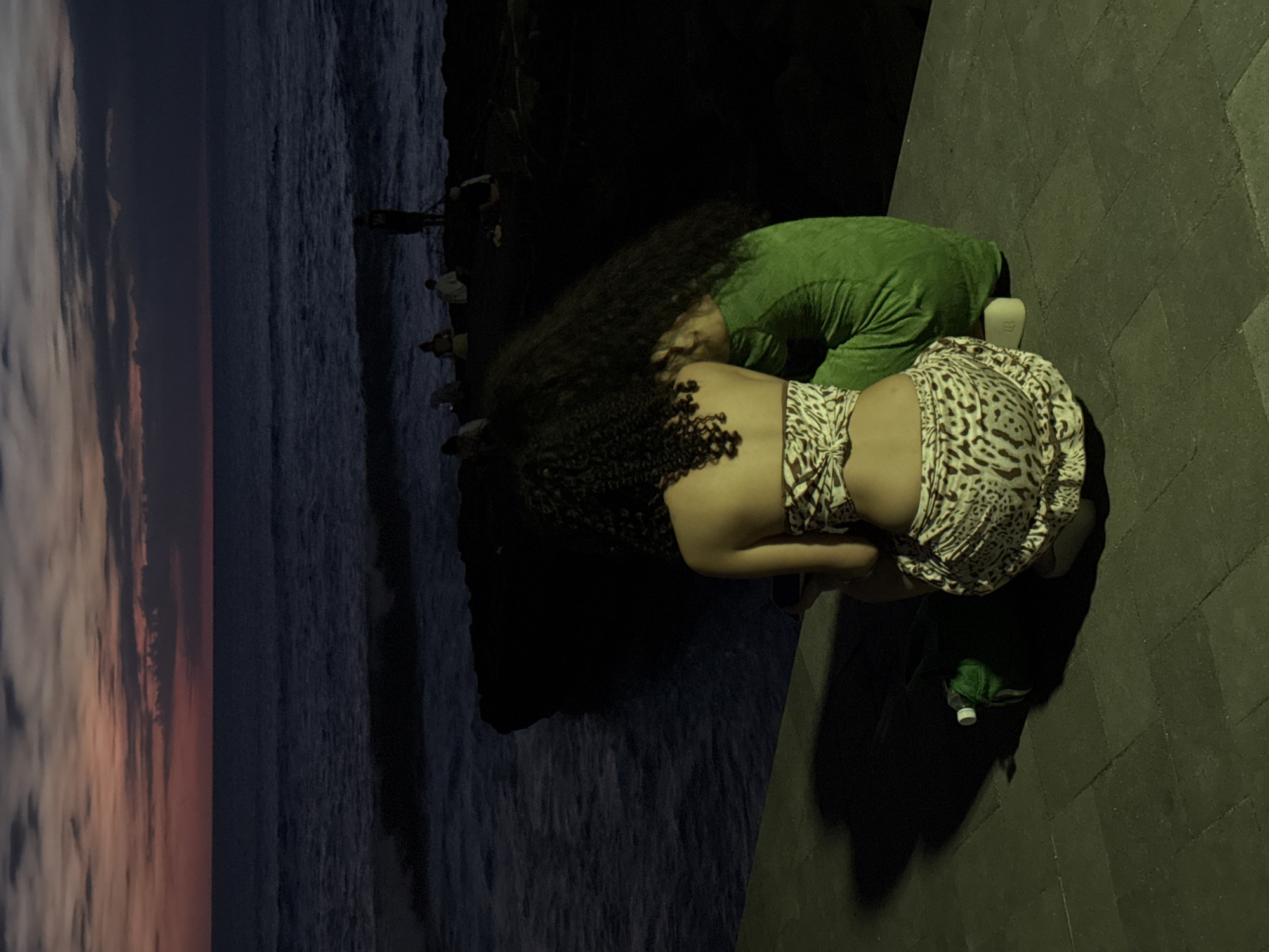 Two women are on a grey concrete path adjacent to a coastline at Pererenan, Indonesia. One woman, in a green garment, is partially visible, lying face down. The other, wearing a light-colored leopard-print dress, is leaning over her, face towards the ocean. The coastline features the ocean on the left and dark cliffs in the center. Several people are on the cliff. There is an orange and grey sunset sky on the left. A green water bottle sits on the path near the women.