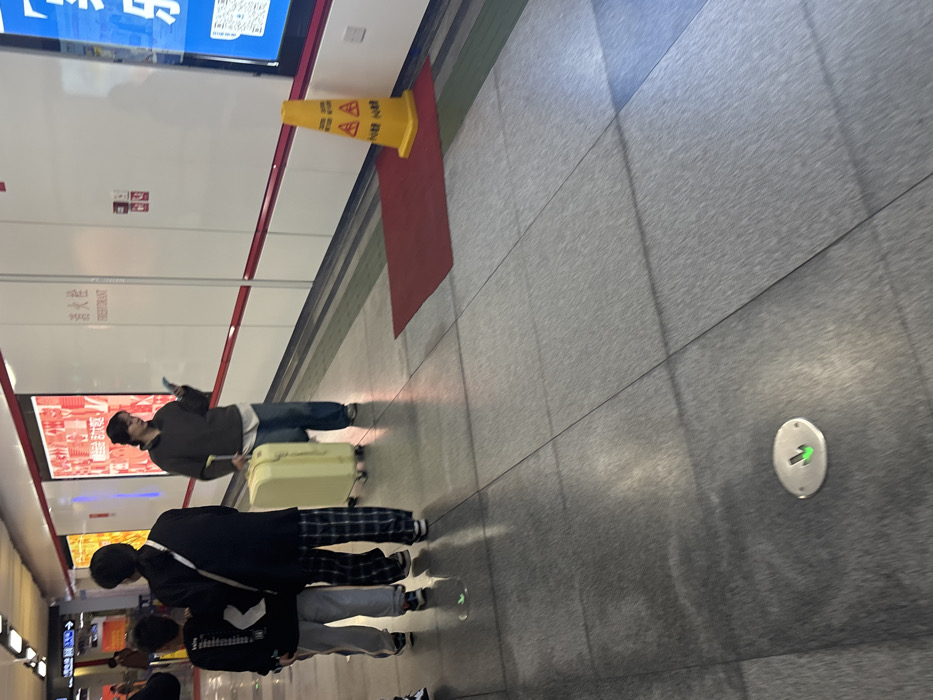 busy metro station with passengers walking and pulling luggage. A yellow caution cone stands on a red mat against a white wall with signage. People are waiting or passing through, their attire ranging from casual to formal. A green arrow indicator is embedded in the grey tiled floor. The overall scene suggests a routine day at a transportation hub.