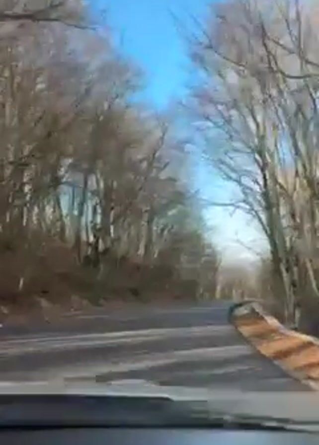 car driving on an empty asphalt road lined with bare trees, possibly in winter. The sky above is a bright, clear blue with scattered white clouds. The road curves gently, and sunlight occasionally peeks through the trees. The interior of the car is visible at the bottom of the frame, and the dashboard is light gray. There are no visible people or interactions in the video.