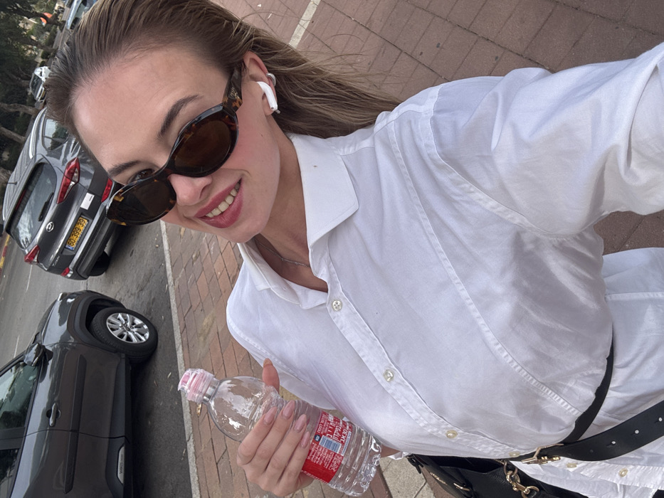 A young adult female is depicted in a close-up, waist-up portrait taken outdoors on a brick-paved sidewalk. She is wearing a white collared button-up shirt, a dark belt, and a thin silver chain necklace. Dark, tortoiseshell-patterned cat-eye sunglasses, bearing "PRADA" branding on the right temple, cover her eyes. A white earbud is inserted into her right ear. She holds a transparent plastic water bottle with a pink cap and a red label containing Hebrew text in her left hand, which has light-colored nail polish. Her mouth is open in a smile, revealing teeth. In the background, two dark grey SUVs are parked parallel to the curb on a street; the vehicle further back is a Hyundai Tucson displaying Israeli license plate 60-399-39. The scene is located in Ashdod, Israel.