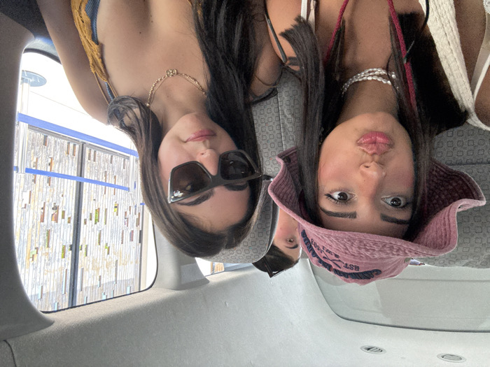 Three young females are observed inside a white passenger van or shuttle, located at what appears to be the Punta Langosta International Pier in San Miguel de Cozumel, Mexico