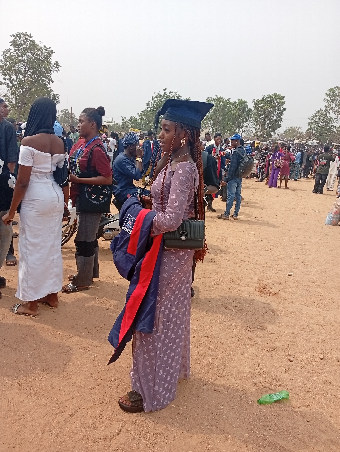 The scene depicts a large outdoor gathering in Adankolo, Nigeria, on an unpaved, reddish-brown dirt ground under an overcast sky. In the mid-ground, a young woman with dark skin and long, braided hair stands prominently. She wears a dark blue graduation cap with a light blue and white tassel, a light purple, long-sleeved, floor-length dress with a subtle repeating pattern, and dark open-toed sandals. She holds a folded dark blue academic gown with red and white trim on her left arm and has a dark green structured handbag with a metallic clasp slung over her right shoulder. She looks to the right of the frame with a neutral expression. To her immediate left, another woman, seen from the back, wears a white off-the-shoulder midi-dress and light-colored sandals. Her hair is covered by a dark headscarf. Behind her, another woman faces slightly right, wearing a maroon t-shirt with a white design, dark trousers, dark sandals, and has dark hair tied up. A dark shoulder bag with a floral pattern hangs from her left shoulder. Partial views of other individuals' legs and torsos are visible in this area. The background is densely populated with a large, diverse crowd of individuals of varying ages and attire, extending into the distance. Some individuals in the background appear to be wearing academic gowns. Scattered trees with green foliage are visible in the far background. On the ground in the lower right foreground, a discarded green plastic bottle is visible. No explicit actions or interactions are prominently displayed among the central figures; they appear to be standing and observing.