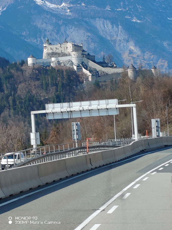 The image displays a panoramic view of Trautenfels Castle (Schloss Trautenfels) situated on a prominent hilltop in the Ennstal valley, near Schladming, Styria, Austria. In the foreground, a multi-lane asphalt highway curves from the lower-left towards the right, featuring white lane markings including a solid line on the left and dashed lines indicating lanes further right. A continuous concrete barrier system (Jersey barriers) separates the visible road from an adjacent section or shoulder to the left. Spanning across the highway is a large white overhead gantry structure with multiple sign panels, supported by two vertical white pillars. Smaller, rectangular grey road signs or electronic display structures on pedestals are positioned behind the main barrier system on both sides of the road. An orange-tipped white pole is visible to the right of the gantry pillar on the right. A white commercial van, equipped with a roof rack, is partially visible in the leftmost lane, traveling away from the camera's perspective. The midground features a steep, rugged hillside rising from behind the highway infrastructure. This hill is densely covered with a mix of predominantly bare deciduous trees displaying brown branches, interspersed with some evergreen conifers, suggesting a late autumn, winter, or early spring season. Dominating the upper-midground is Trautenfels Castle, a large, historic fortified complex. The castle comprises multiple light-colored stone buildings with dark, pitched roofs, several windows, and distinctive turrets featuring conical caps. Extensive defensive walls and circular bastions extend from the main structure, following the natural contours of the hill. In the background, a towering range of snow-capped mountains stretches across the horizon under a clear, bright blue sky. The mountains exhibit visible rock faces and significant patches of white snow at higher elevations. The scene is illuminated by bright sunlight, casting clear shadows. No individuals are visibly present, and no explicit actions or interactions are depicted beyond the implied movement of the van on the highway.