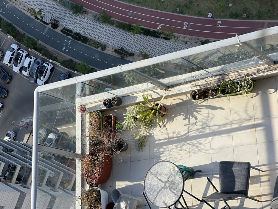 The image displays an overhead perspective from a high-rise balcony located in Kiryat Motzkin, Israel, overlooking urban infrastructure and residential buildings. The balcony features a light-colored tiled floor with prominent shadows cast by direct sunlight. A clear glass railing, supported by white metal posts, encloses the space. Numerous potted plants are arranged along the railing and on the floor. These include large oval terracotta planters containing shrub-like foliage, some appearing dry, alongside smaller black pots holding various green plants, including a variegated spider plant and a broad-leaved plant in a brown pot. A light green rectangular planter also holds small plants. An empty white plastic bucket is on the left side of the balcony. A circular glass-top table with a black metal frame and a single black metal chair with a slatted back and seat are positioned in the foreground. A green watering can is visible beneath the table. No individuals are present on the balcony. Beyond the balcony, a multi-lane asphalt road with a line of parked cars, predominantly light-colored SUVs and dark sedans, is visible. Adjacent to the road, a patterned grey and white pedestrian walkway extends parallel. Further right, a two-way asphalt bicycle path is marked with white dashed lines and bicycle symbols. Beyond this, a red athletic running track is visible, featuring white lane markings and distance markers, specifically "350." A single individual wearing a light-colored shirt is observed on the running track near the "350" mark, appearing to be standing or walking. In the background, multiple modern multi-story apartment buildings are present. The scene is illuminated by strong, direct sunlight.