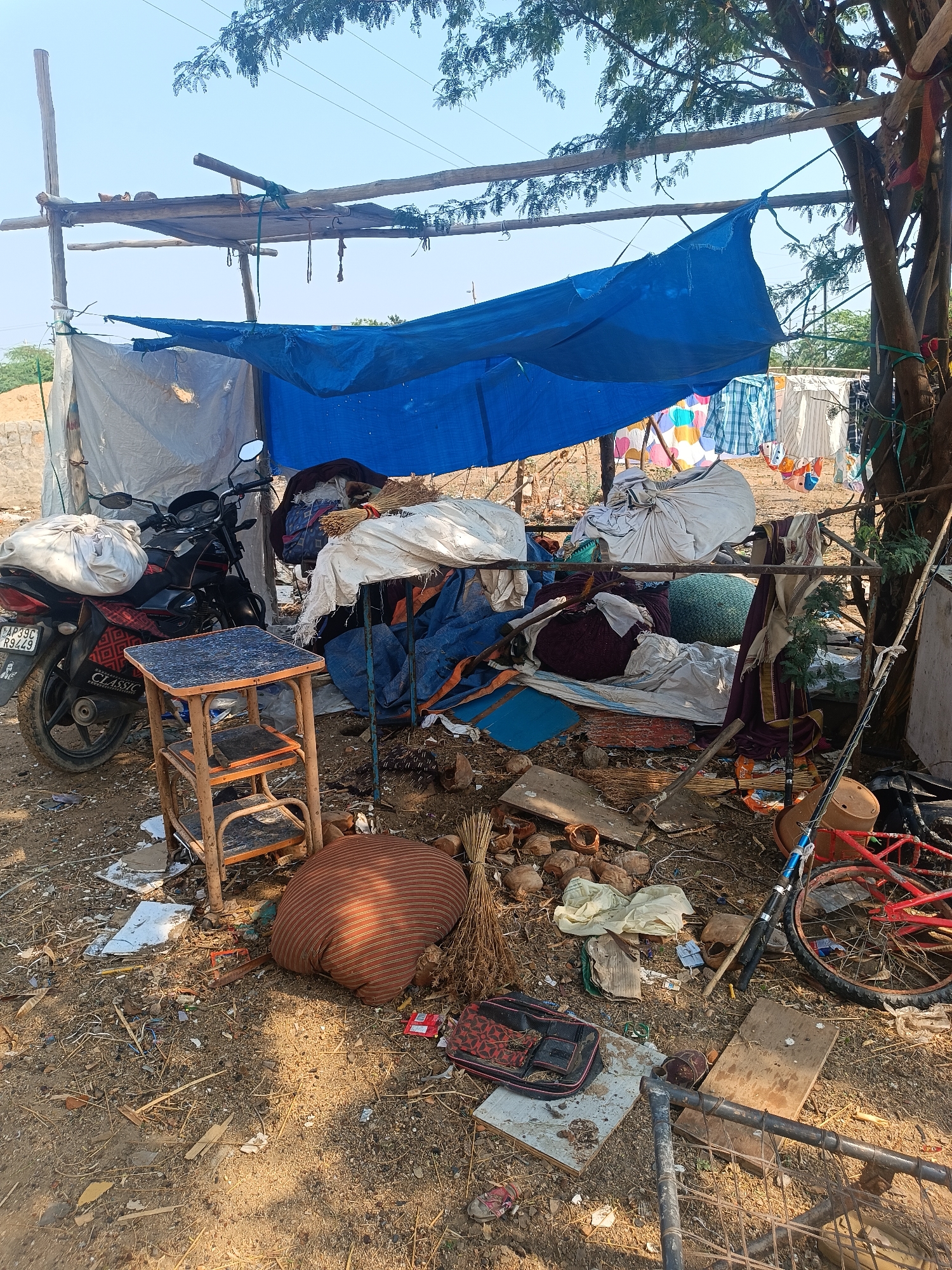 The image depicts an outdoor, makeshift encampment or temporary living space in Pedda Kammavaripalli, India, under clear daylight conditions