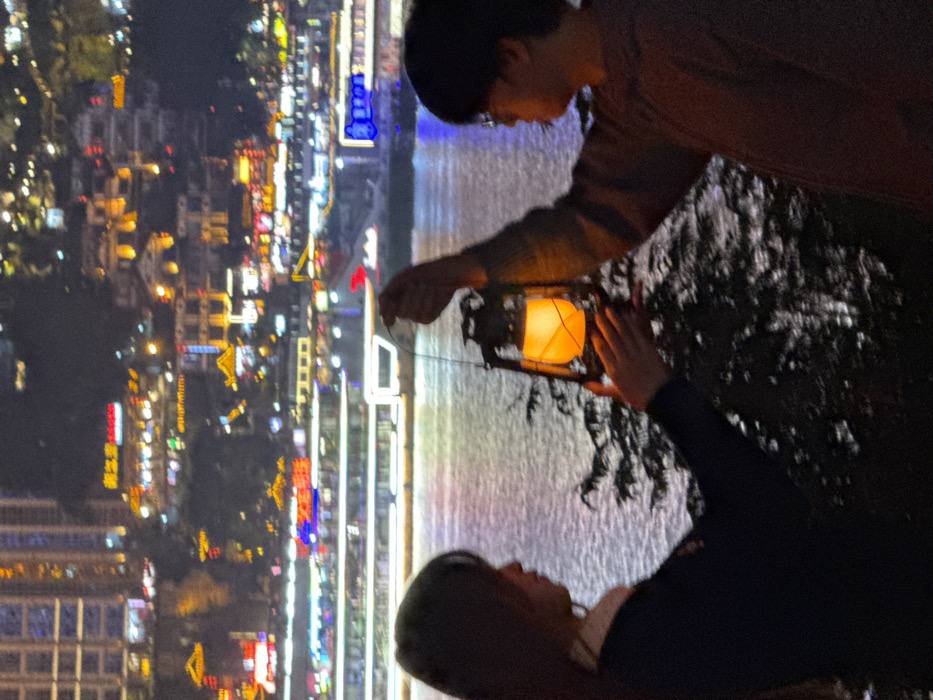The image depicts a night scene on a riverbank in 江北城街道, China. In the foreground, two individuals are partially visible, silhouetted against a brightly lit urban background. A vintage-style lantern, emitting a warm orange glow, is held centrally between them. The individual on the left, appearing female with long dark hair, supports the lantern from below with her left hand. The individual on the right, appearing male and wearing glasses, holds the lantern's upper handle with his right hand. Dark foliage is visible below the lantern, partially obscuring the immediate foreground. In the midground, a wide river reflects numerous city lights, with several large, brightly illuminated vessels or cruise ships positioned on the water. The background reveals a densely lit cityscape on the opposite riverbank, featuring a mix of modern high-rise buildings and traditional Chinese architectural structures, all extensively illuminated. The scene is characterized by widespread artificial light, reflecting off the water and illuminating the structures of the bustling urban waterfront.