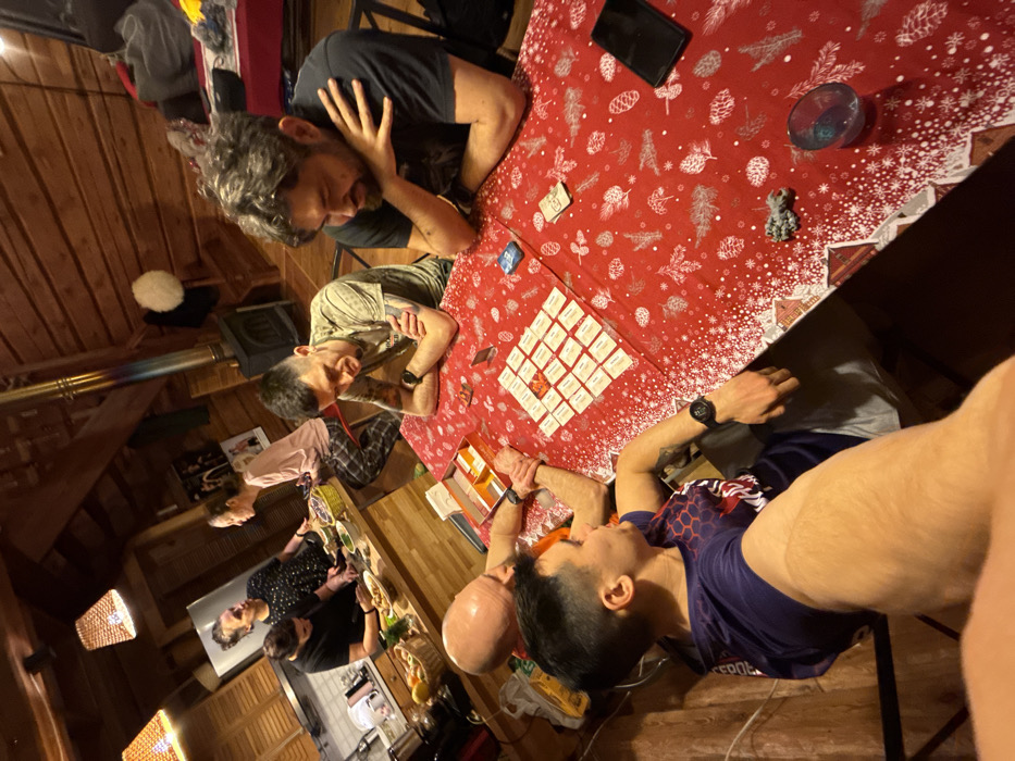- "Four people are gathered around a table covered with a red tablecloth featuring white snowflake and pinecone patterns, seemingly playing a card game" by FM-iCO5W2, licensed under CC BY 4.0