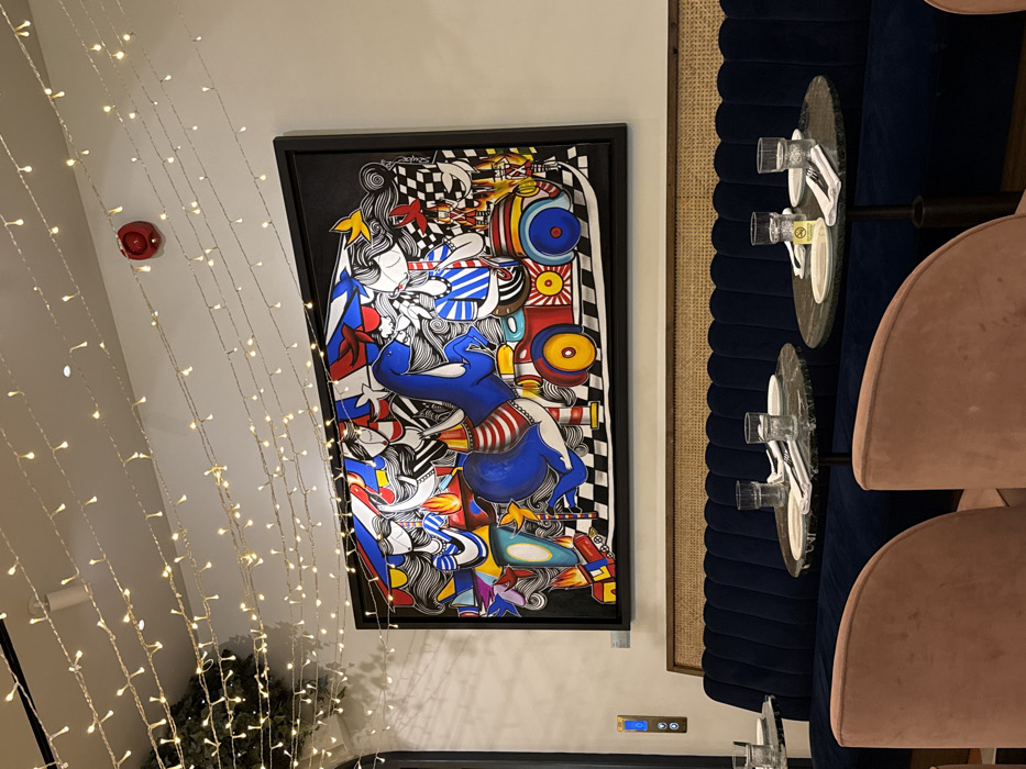An art piece featuring a figure, checkered patterns, and vibrant circles hangs on the wall