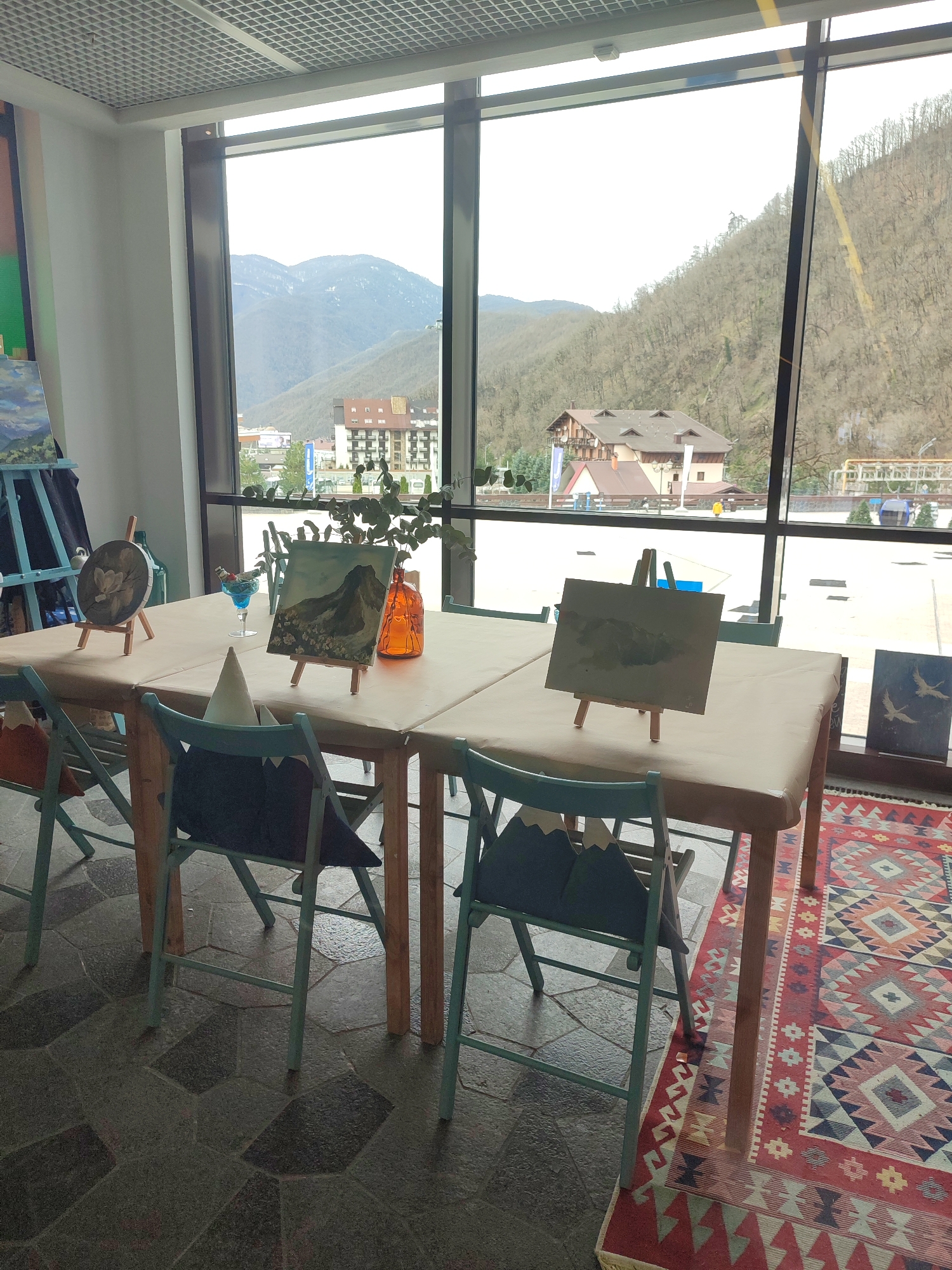 A brightly lit interior scene displays a long, rectangular table covered with a beige cloth, acting as a workstation. The table is adorned with various artistic elements: three small easels, each supporting a canvas with landscape paintings, a circular painting, an orange vase with green foliage, and a cocktail glass filled with a blue liquid. Four chairs, painted in a light blue shade and featuring decorative triangular backrests, surround the table. A large window behind the table provides a scenic view of Estosadok, Russia. The landscape includes buildings, a parking lot, and mountains covered in trees under a cloudy sky. A decorative, patterned rug partially visible on the right side of the image adds warmth to the setting. The floor is covered with geometric tile of neutral colors.