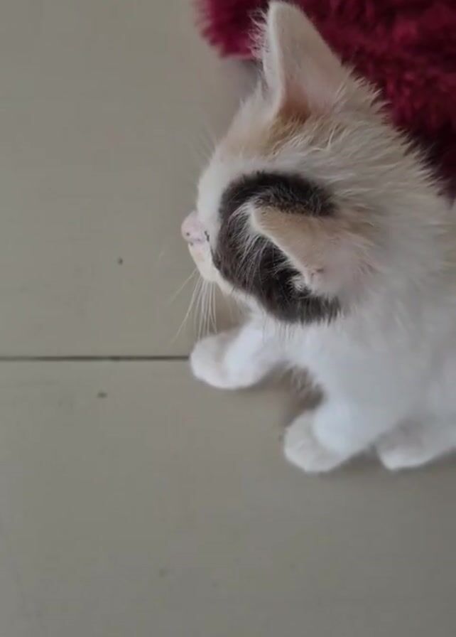 A kitten, predominantly white with black and tan patches, is the focus. It's perched on a pale tile floor next to a fluffy, maroon-colored object. The kitten looks up, its eyes opening wider, and sticks its tongue out slightly.
